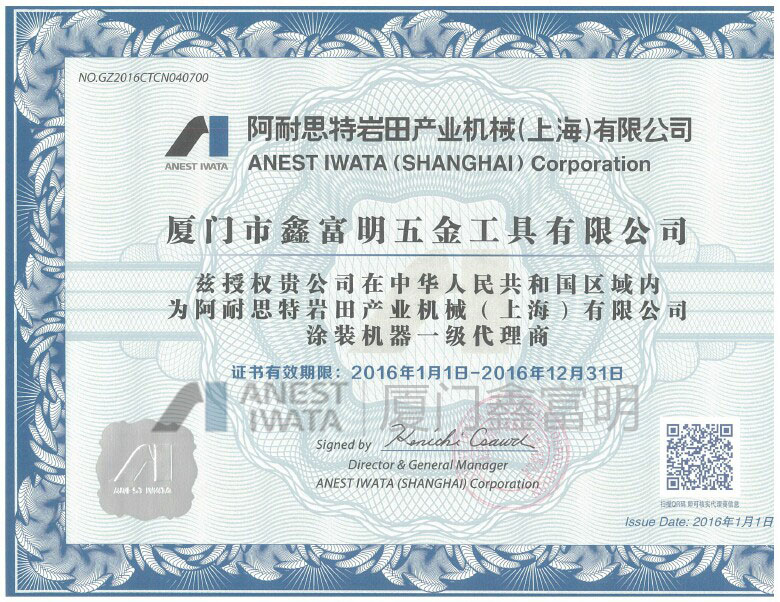廈門市鑫富明五金工具有限公司已連續多年獲得日本阿耐思特巖田特約代理商授權證書,授權在中國范圍內代理銷售涂裝機械,其中包括:巖田噴槍、巖田隔膜泵、巖田壓力桶、巖田氣動工具、巖田空壓機、巖田噴涂機……